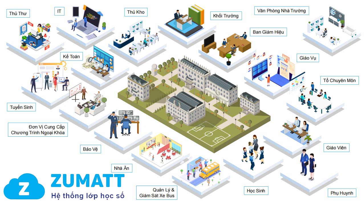 Zumatt là một hệ thống Quản lý, Điều hành, Dạy-Học & Thông tin liên lạc (All in one) đáp ứng tất cả các yêu cầu & nghiệp vụ của một trường học. Đặc biệt phù hợp với những tường ngoài công lập. Zumatt giải quyết hoàn toàn các bài toán quản lý đặt ra cho nhà trường từ hoạt động tuyển sinh, thi đầu vào, dạy và học, quản lý các loại dịch vụ trong trường, học phí, tới chấm công, đánh giá giáo viên trong trường. Hệ thống đặc biệt phù hợp với mô hình trường học.